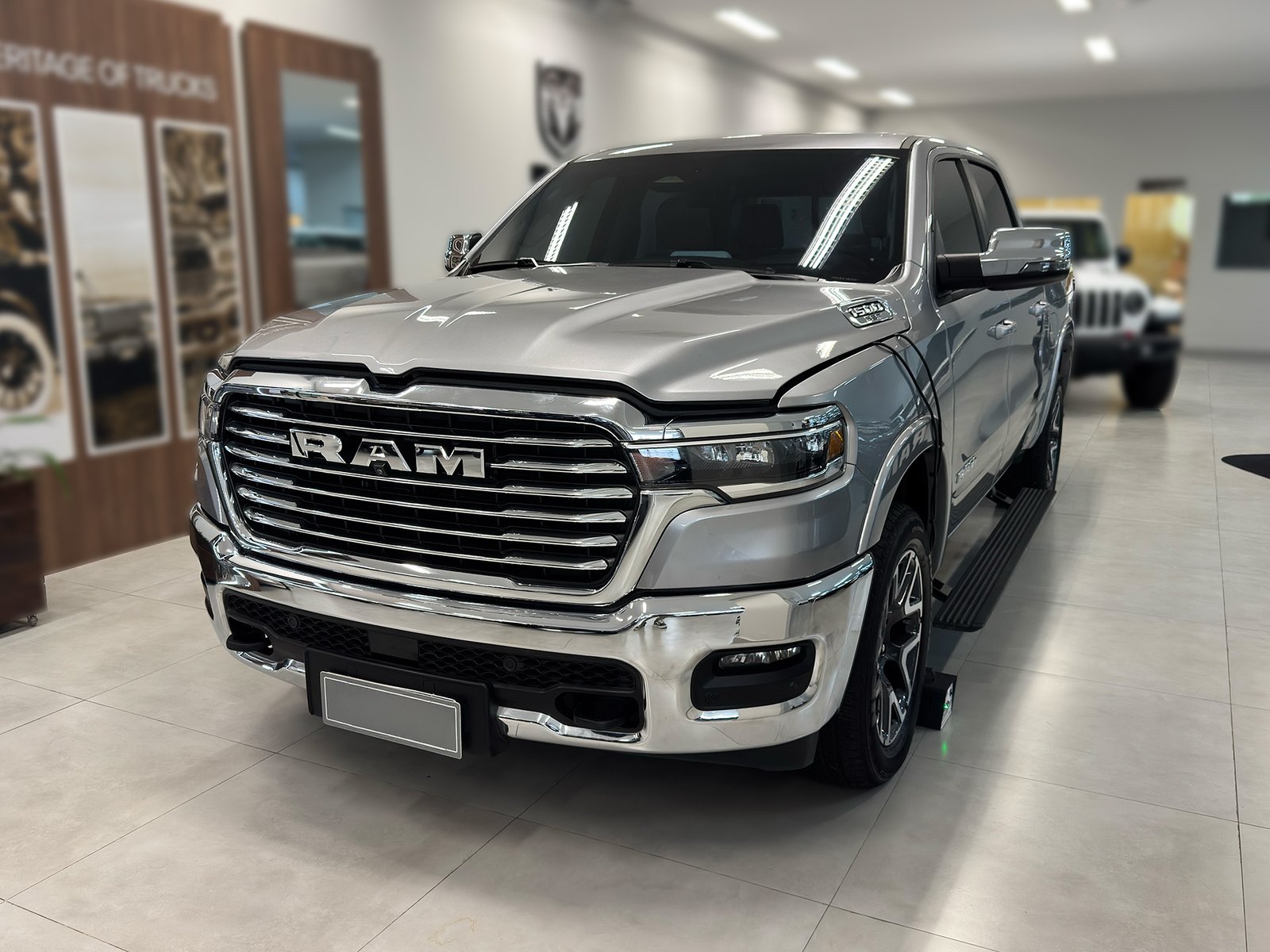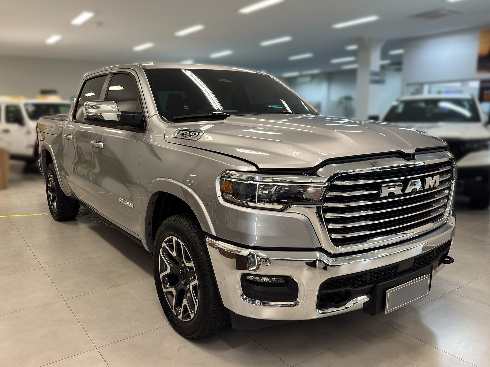 Seminovo com apenas 17.000km, versão top de linha Laramie CD 4×4, motor Hurricane 3.0 biturbo a gasolina com impressionantes 420cv de potência e torque robusto, câmbio automático de 8 marchas, cor prata sofisticada, único dono, acabamento premium com tecnologia de ponta, PPF Full aplicado em toda a carroceria para proteção total da pintura contra riscos e intempéries, película antivandalismo nos vidros para segurança adicional, película solar de alta performance Nano Carbono para conforto térmico superior, a RAM 1500 é referência absoluta em picapes full-size no mercado brasileiro, combinando luxo, tecnologia americana e performance incomparável, ideal para empresários e executivos que buscam uma picape de alto padrão com proteção premium e acabamento diferenciado.